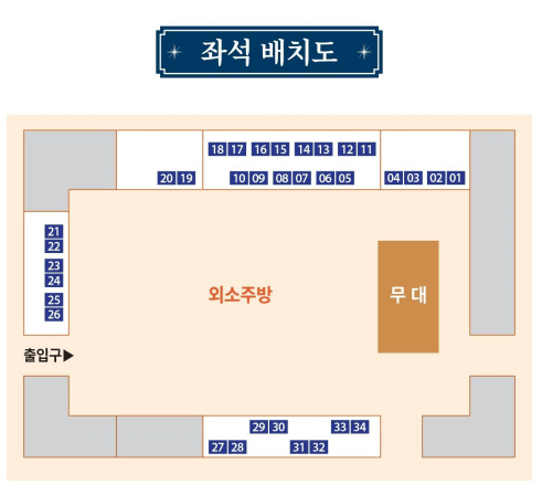 - 외소주방에서는 궁중음식 체험과 국악공연이 진행됩니다. '도슭수라상’이라는 12첩 반상을 현대적으로 해석한 음식을 맛볼 수 있습니다. 이곳에서 왕과 왕비에게 올리던 최고의 일상식을 경험할 수 있습니다.
