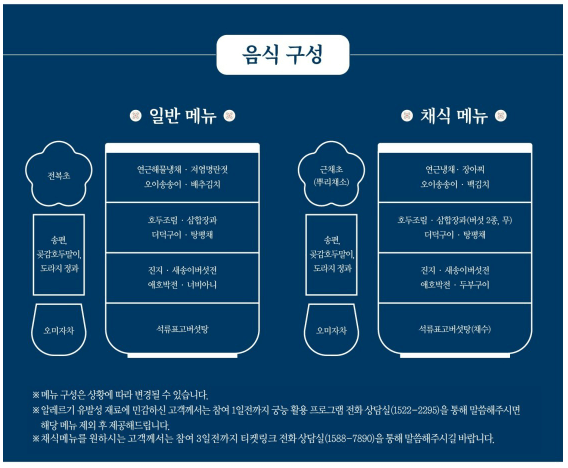 - '도슭’은 도시락의 옛말로, 왕과 왕비에게 올리던 최고의 일상식인 12첩 반상을 현대적으로 해석한 음식입니다. 알레르기 유발성 재료에 민감하신 분들은 관람 1일 전까지 궁능 활용프로그램 전화 상담실(1522-2295)로 연락 주시면 해당 재료를 제외 후 제공해 드립니다.