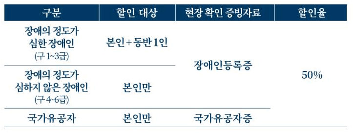 - 할인은 예매 시 적용 가능하며, 일반 권종으로 예매 후 현장에서 할인 적용 (차액 환불)이 불가합니다.